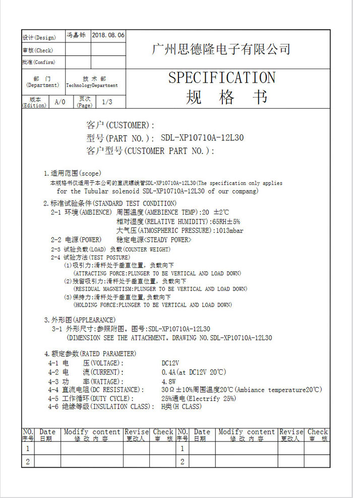 | 电压: | DC12 V | 行程: | 电阻: | 30Ω | 功率: | 4.8W | |