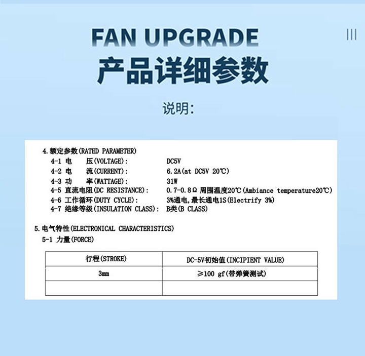 | 电压: | DC5V | 行程: | 3mm | 电阻: | 0.7~0.8欧 | 功率: | 31W |